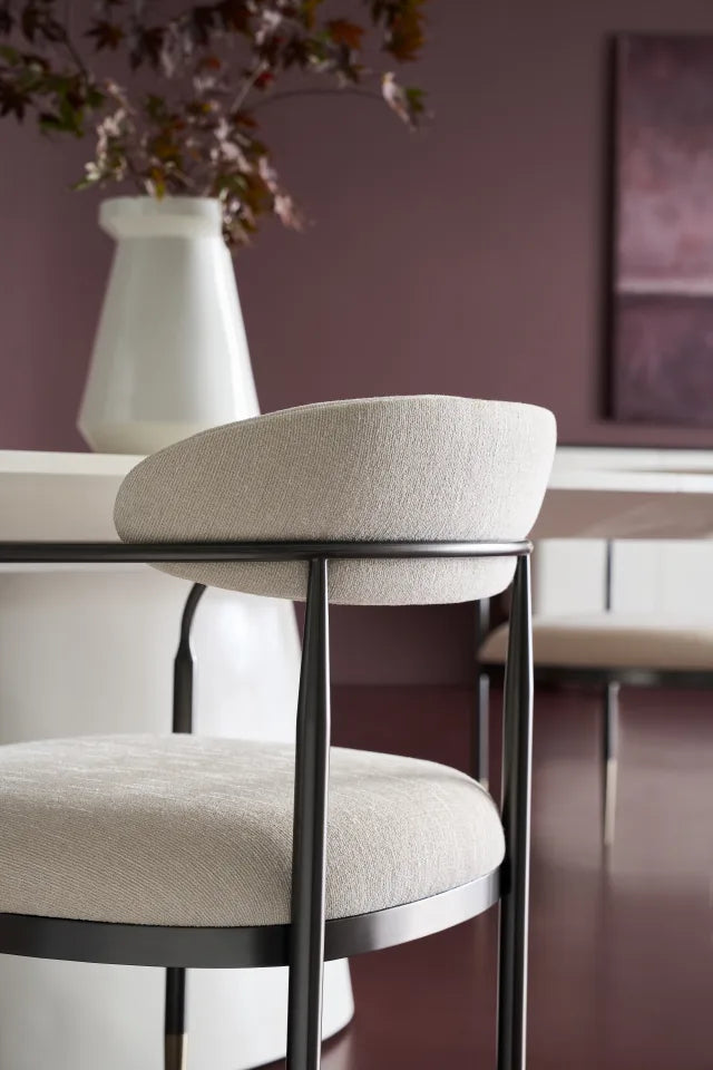 This armchair lives up to its memorable name. Epoch is a study in contrasts. The oval, curved back and tight seat feature Ivory woven performance fabric. The back and seat float in an open, dark frame in Deep Bronze metal enhanced with Champagne Gold metal ferrules. This is a piece that compliments classic or contemporary décor.