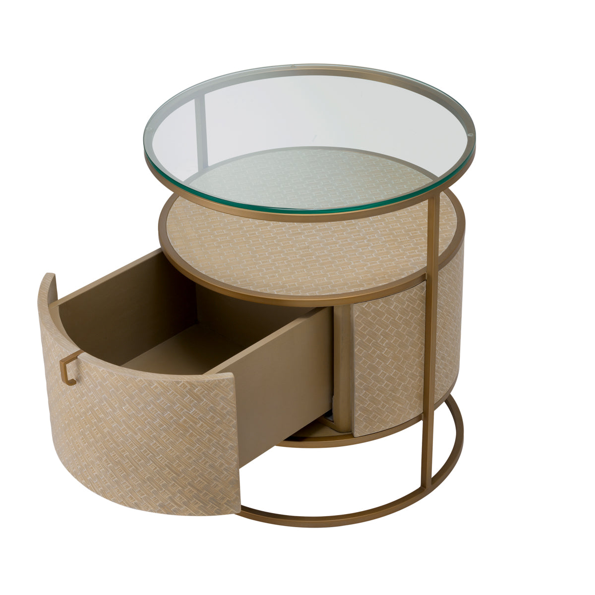 Pairing Bauhaus style with a Mid-Century Modern look, the tapered Napa Valley Nightstand showcases a sleek brushed brass finished frame, a clear glass tabletop and a drum-shaped centrepiece that is lined with woven veneer, containing a drawer with a stainless steel handle.